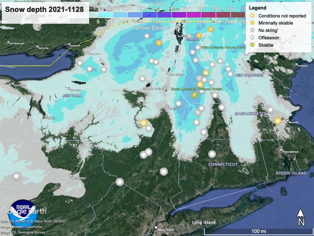 Snowfall across the higher elevations has left some accumulation, but not enough to open in places without snowmaking to augment the cover. Prospect Mountain is open and grooming with 12″ of new snow.