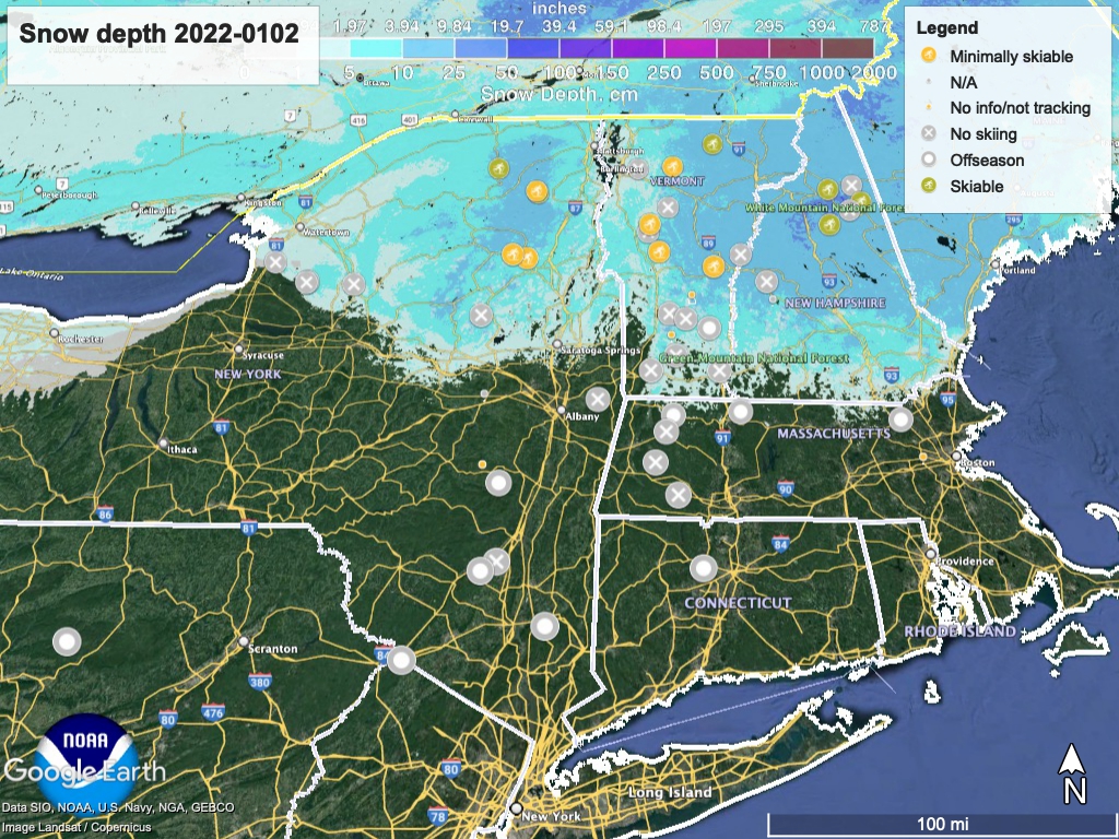 A minor snowfall on New Year’s didn’t do much except in the northern Adirondacks, where some portions received 4″ or so. Rain and warm temps today largely killed the slight snow cover elsewhere.