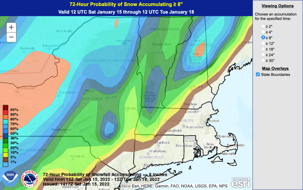 As shown by the light blue and orange regions in the graphic below, the chances for greater than 8″ accumulation in the Tug Hill, northern Adirondacks, and White Mountains of New Hampshire are quite good. It’s 50-50 whether the Catskills and southern Green Mountains will get that much, but even 4″ would help a lot.