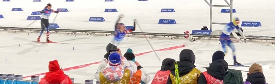 … on winning a Bronze medal in the women’s cross-country freestyle sprint; and to teammate Rosie Brennan who came in close behind in fourth. The featured photo for this post (via Twitter @pegmcshinn) shows a blurry Diggins in the center just crossing the finish line with Brennan right behind. Diggins was maybe 1/4-second behind Silver medalist Maja Dahlqvist.