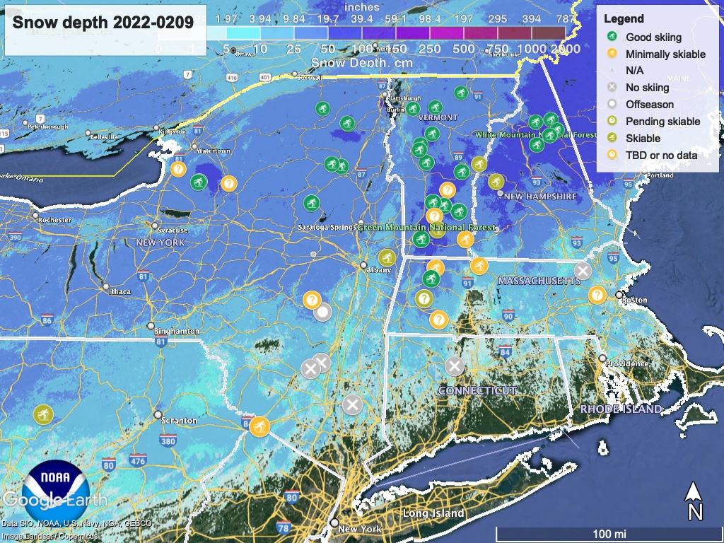 North of Albany and southern Vermont the trails are a bit better, as the colder temps and greater snow depth give the groomers more to work with. In particular the Tug Hill and the White Mountains got a decent refresh of snow recently.