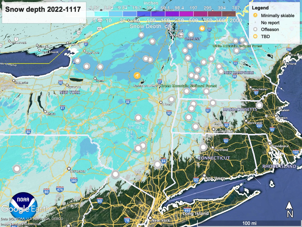 Thanks to an. early-season storm, areas touched by lake-effect snow have received enough snow to open. Western NY near Buffalo and the Tug Hill area, as well as east into the Adirondacks and northern VT have received anywhere from several inches to a few feet.