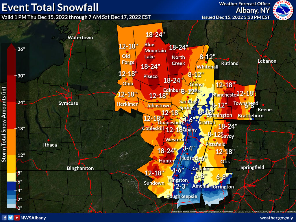 Accumulations could be very significant from the Catskills to southern Adirondacks, Berkshires, and southern Green Mountains. Total snowfall is expected to lessen further north.