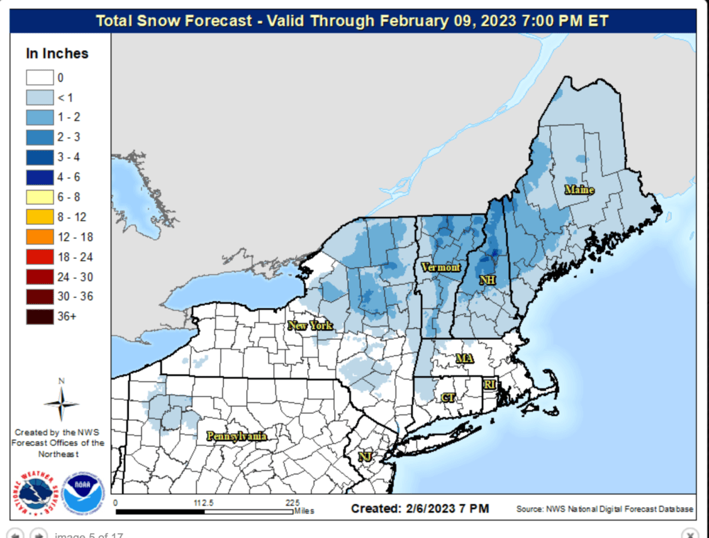 Two small low-pressure systems come into the northeast Tuesday and Thursday. There’s a chance of some snow, but not much accumulation. With mid temperatures more reminiscent of early spring than mid-winter, the remaining snowpack will become granular and depth will lessen through the week.