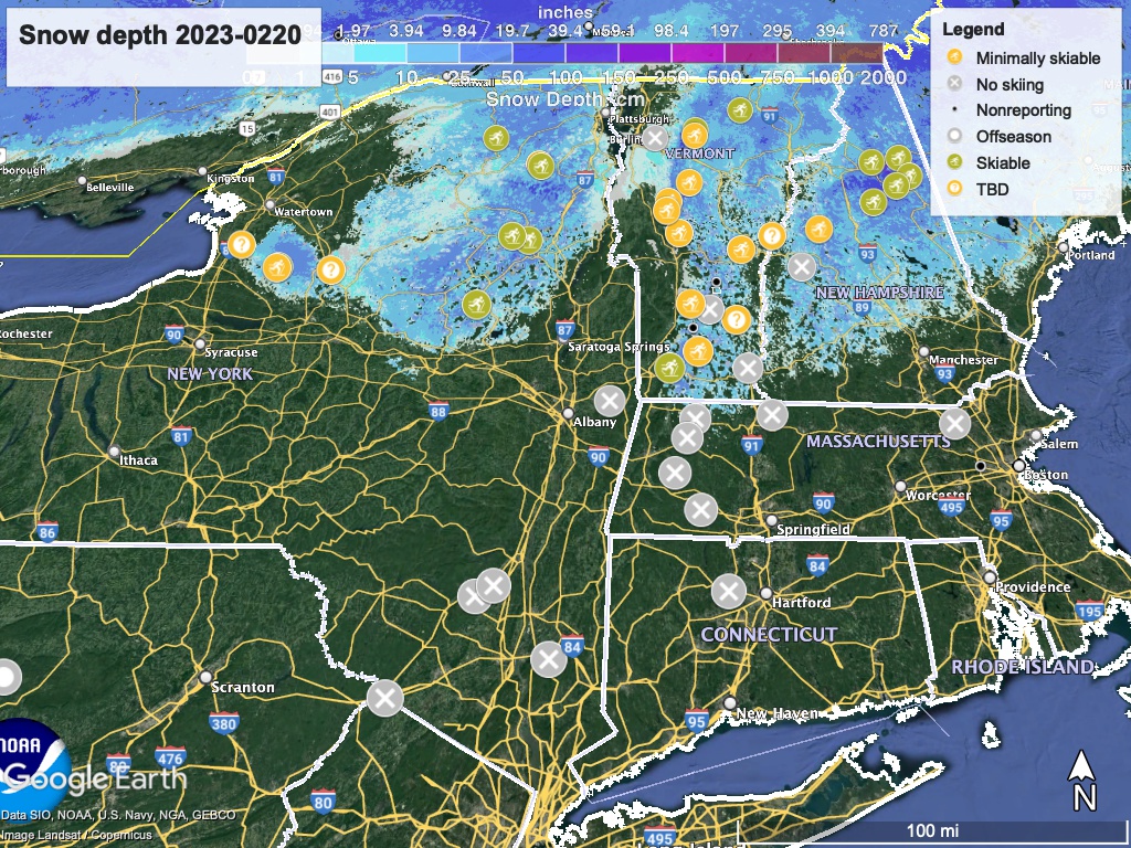 Weekly warm spells in the Northeast make for easy if uninteresting reporting on conditions. Tending a diminishing snowpack, groomers and skiers have to work with frozen or frozen granular conditions in the morning, and loose granular or wet granular in the afternoon. Mid-mornings generally make for better if thrilling, skiing.