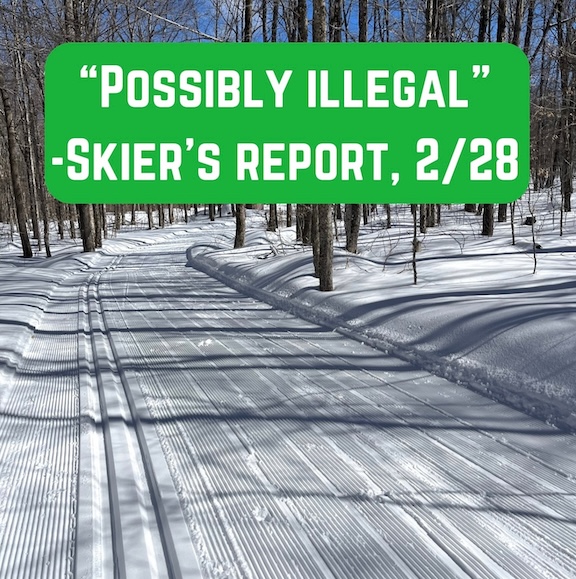 As of March 1: Generally warm weather at the end of February made for very comfortable spring skiing, if a bit damp with freezing rain in spots. Up north, a couple of inches of fresh snow every few days made for fun times and challenging wax choices for classic skiers. BETA report of 2/27 said backcountry was ‘still enjoying pretty stellar mid-winter conditions. ‘