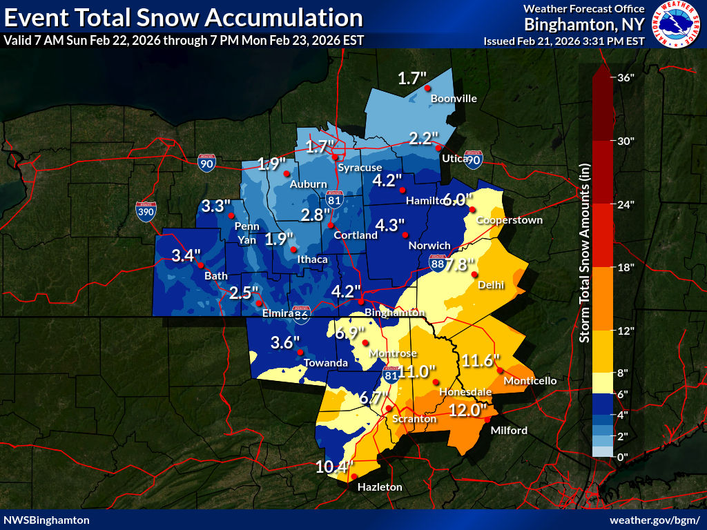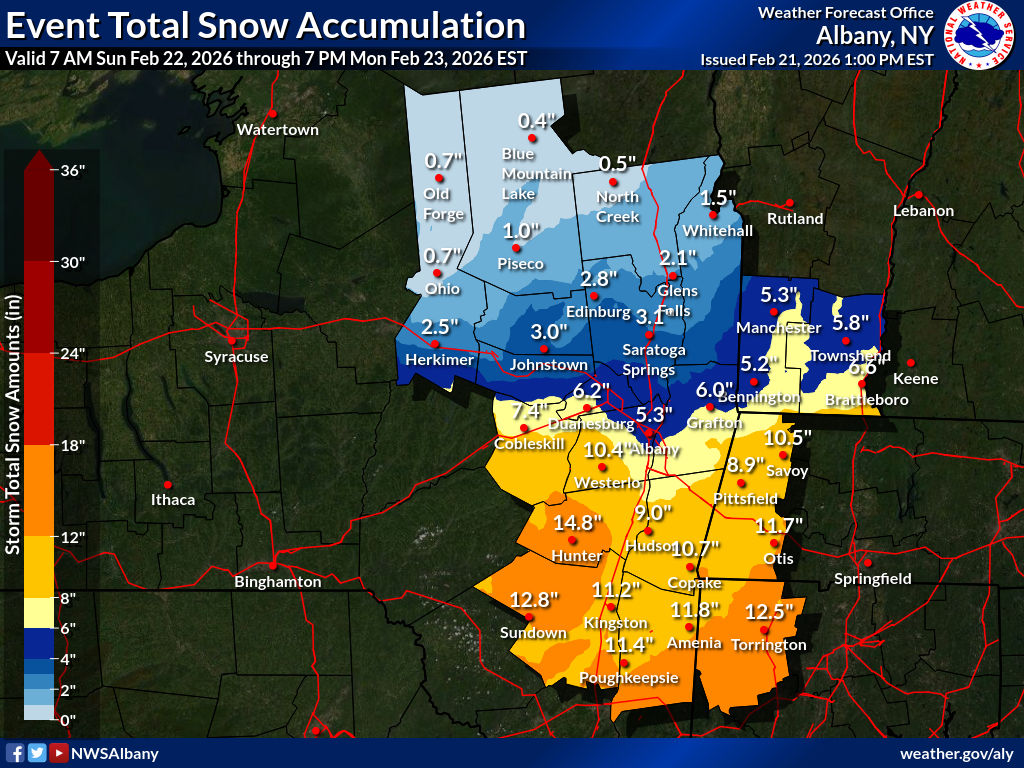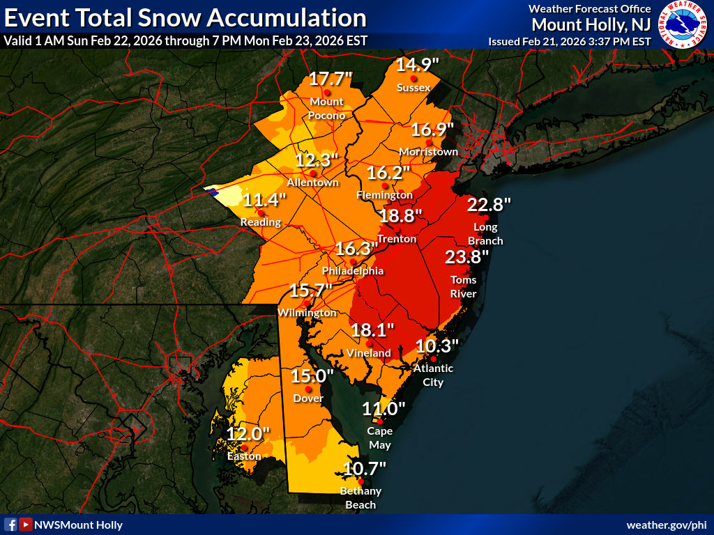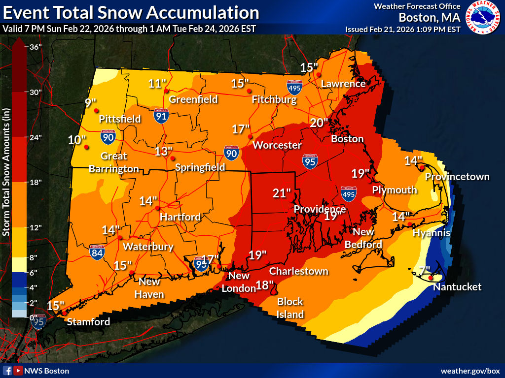 Given the huge population that will be affected, below is a slideshow gallery of graphics from each regional office from Philadelphia to Boston, and Albany to the north, showing a more detailed mapping of forecasted snow through Tuesday 2/24 (updated Saturday afternoon 2/21.