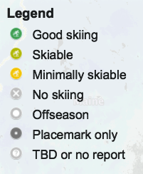 - A snowflake instead of a skier indicates an expected, or ‘pending’ state of skiability, with the color of the expected state. This is used for areas where trails are closed when I checked (e.g., midweek) but will reopen within a day or so. Click the mark for more details- usually ‘Word’ will indicate when they will reopen.